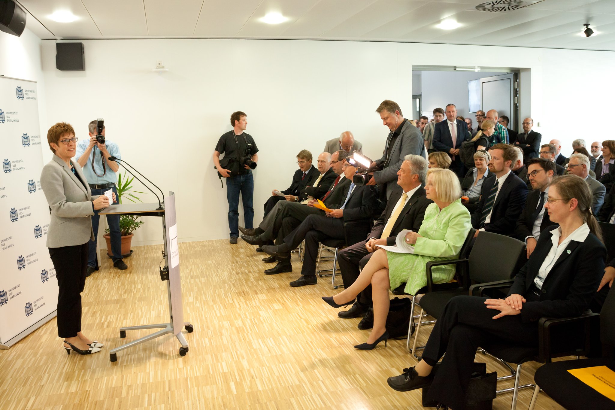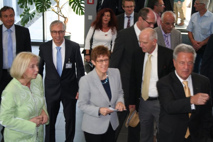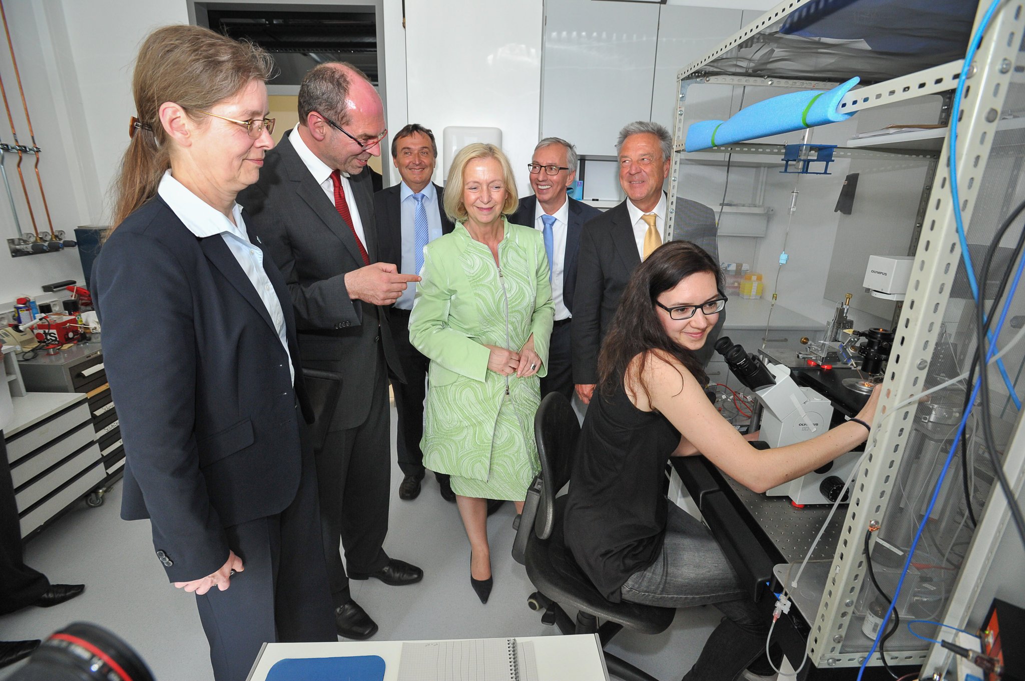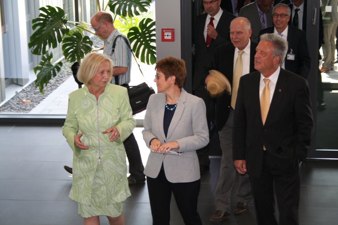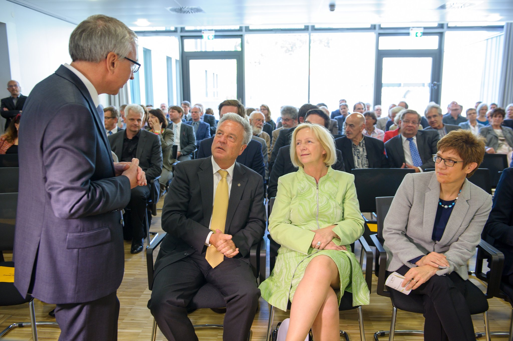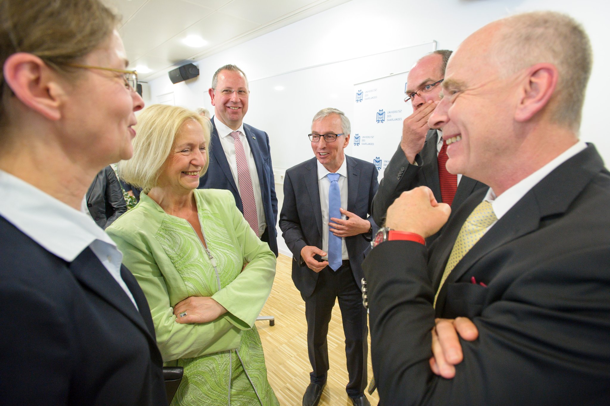 Inauguration CIPMM 2015: J. Wanka, Bundesministerin für Bildung und Forschung; A. Kramp-Karrenbauer, Ministerpräsidentin des Saarlandes; Prof. Dr. V. Linneweber, Präsident der Universität des Saarlandes; Prof. Dr. M. Menger, Dekan der Medizinischen Fakultät; CIPMM Gründungsdirektoren: Prof. Dr. Dr. F. Zufall und Prof. Dr. J. Rettig; und andere Gäste. (idw news).